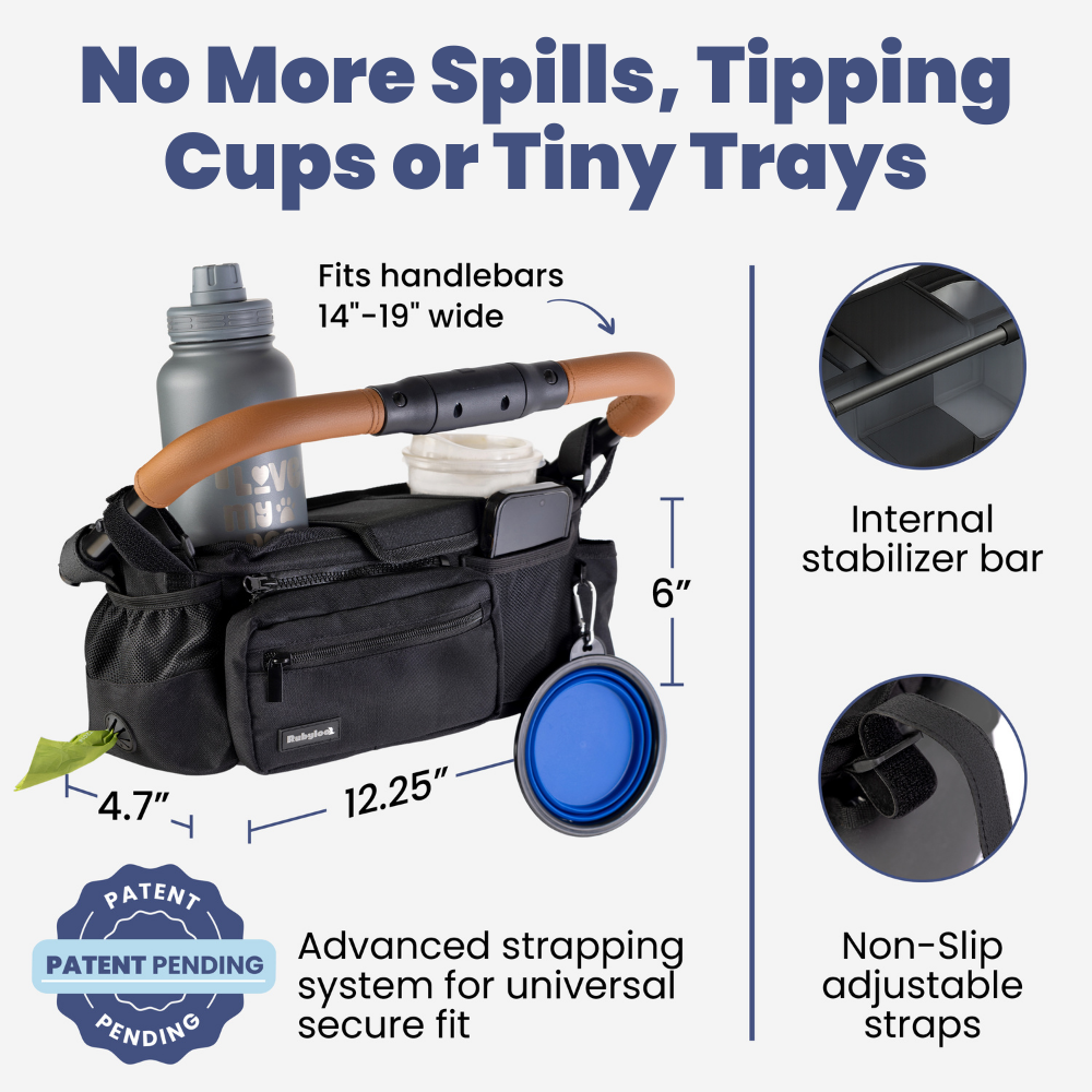 - NON-SLIP STRAPS FOR SECURE & STABLE FIT – Fits most pet strollers with 14"-19" wide handlebars. Features extra-strong, universal fit non-slip straps to keep the caddy securely in place, unlike standard plastic trays that spill drinks on bumpy terrain.